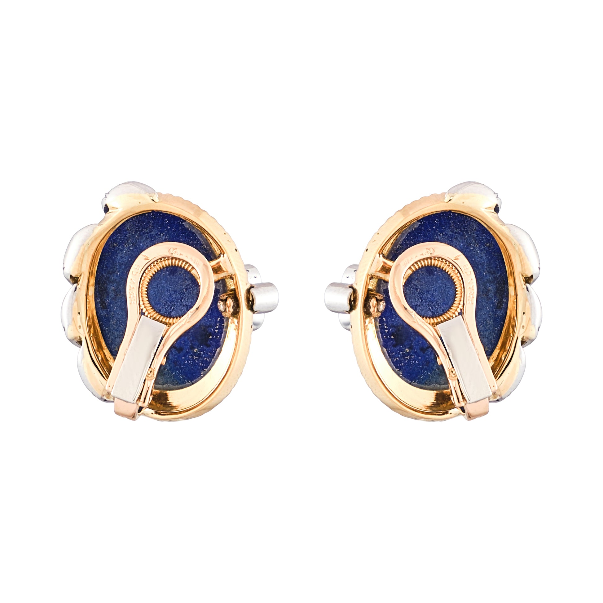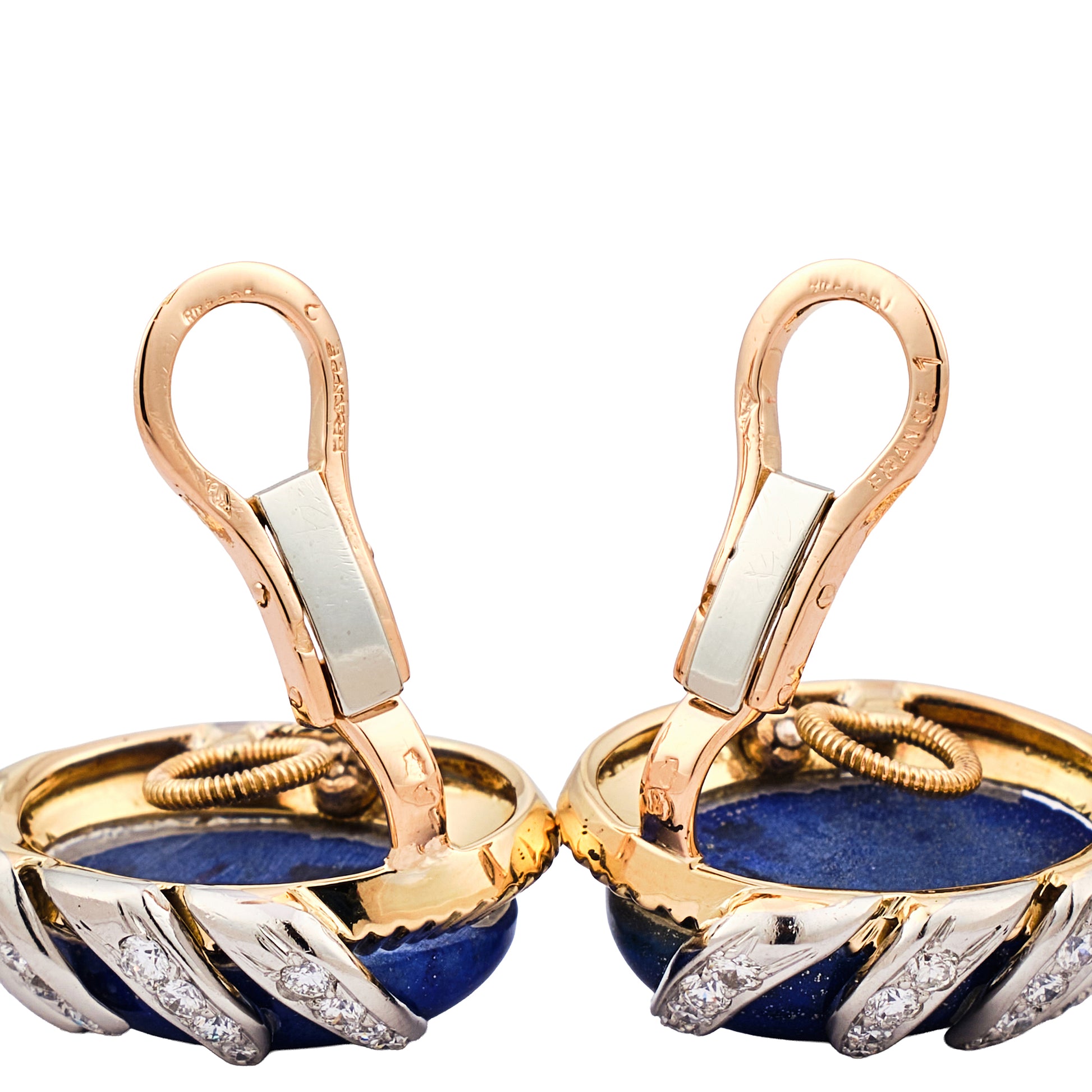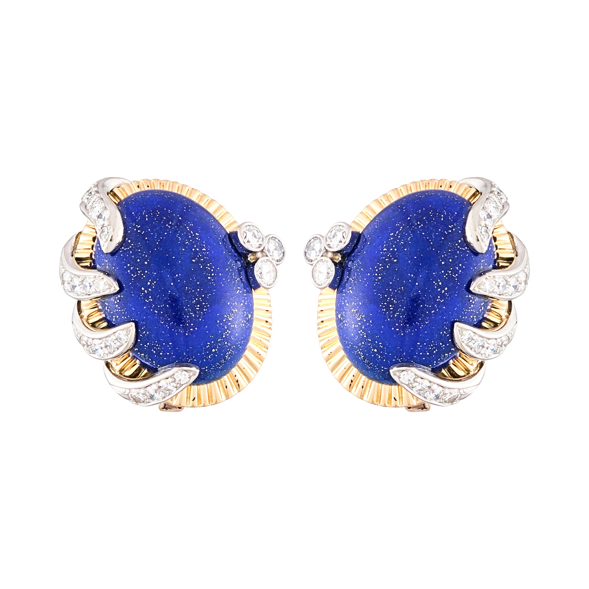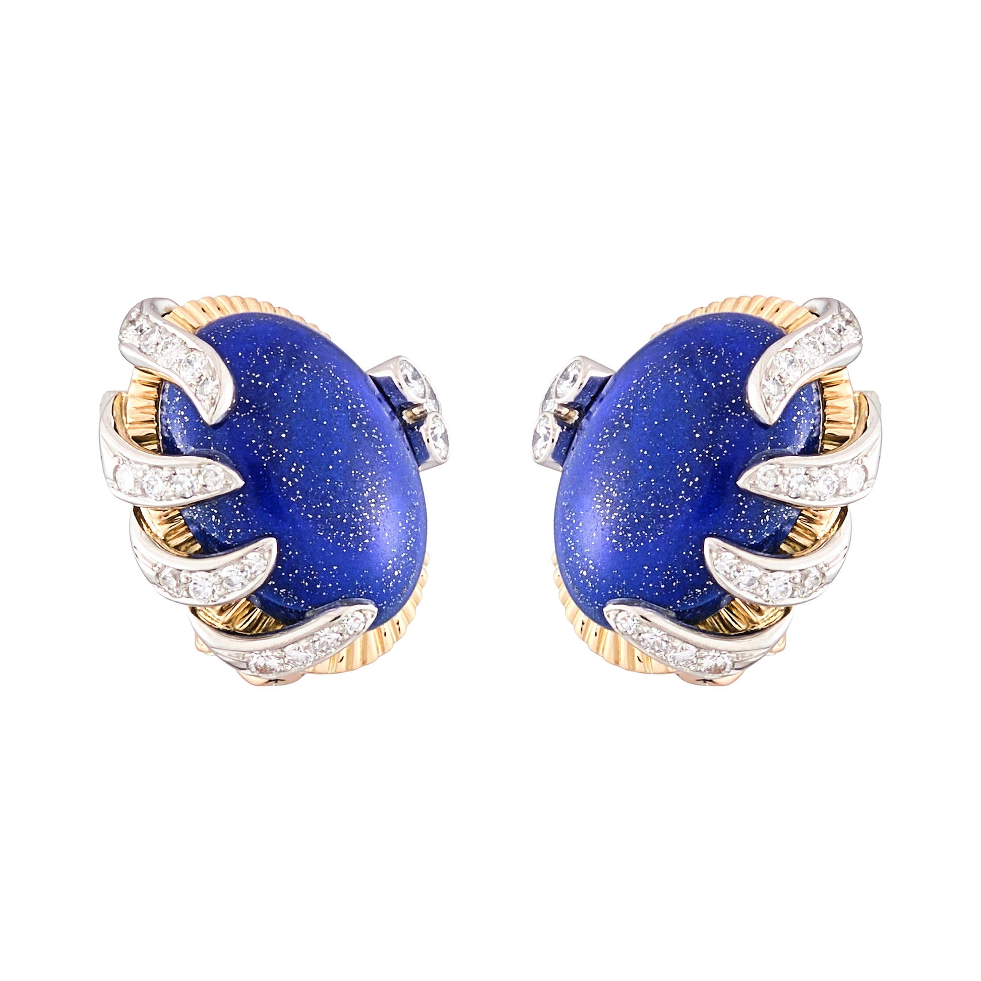 18 Kt yellow and white gold earrings set with oval cabochon Lapis Lazuli and round brilliant cut diamonds.