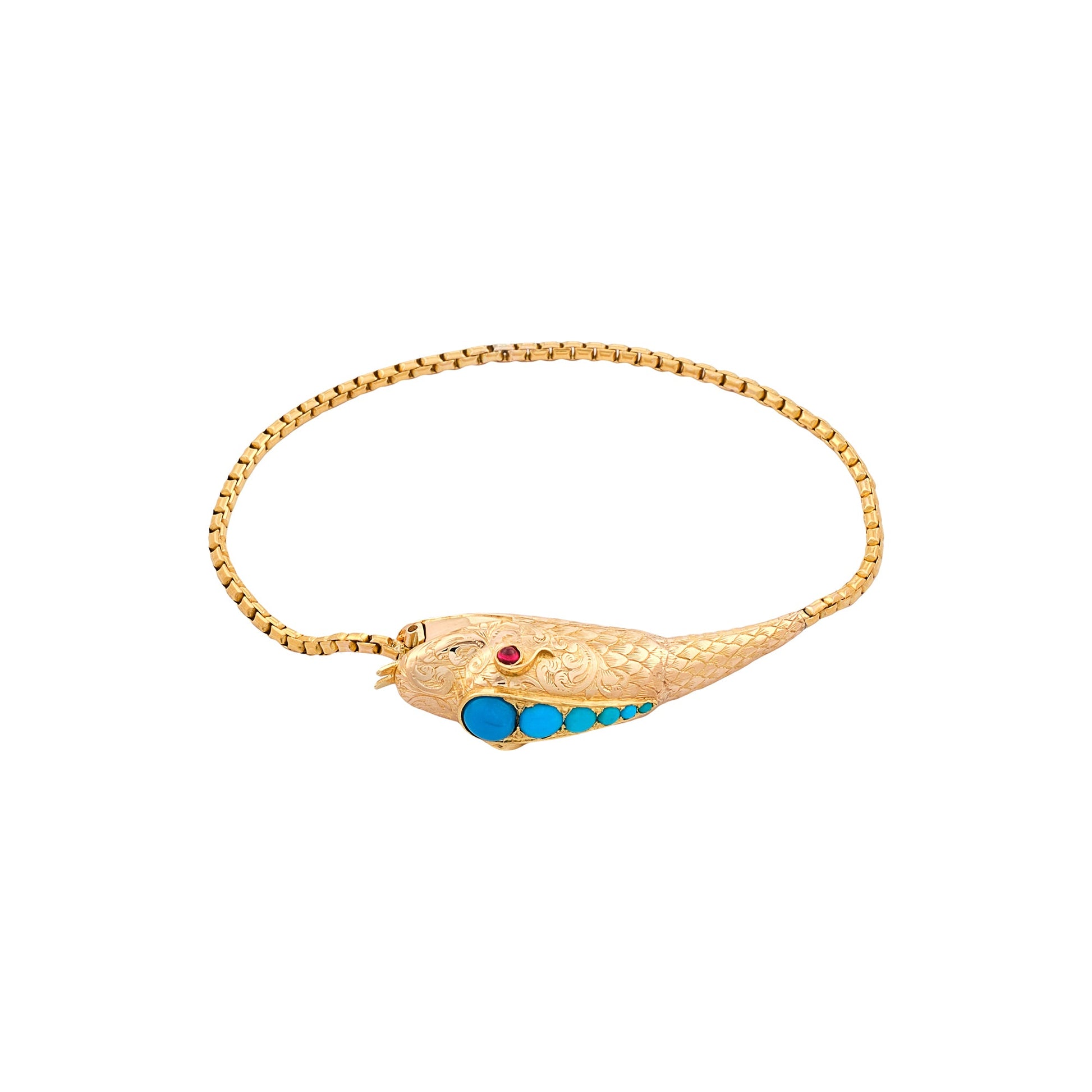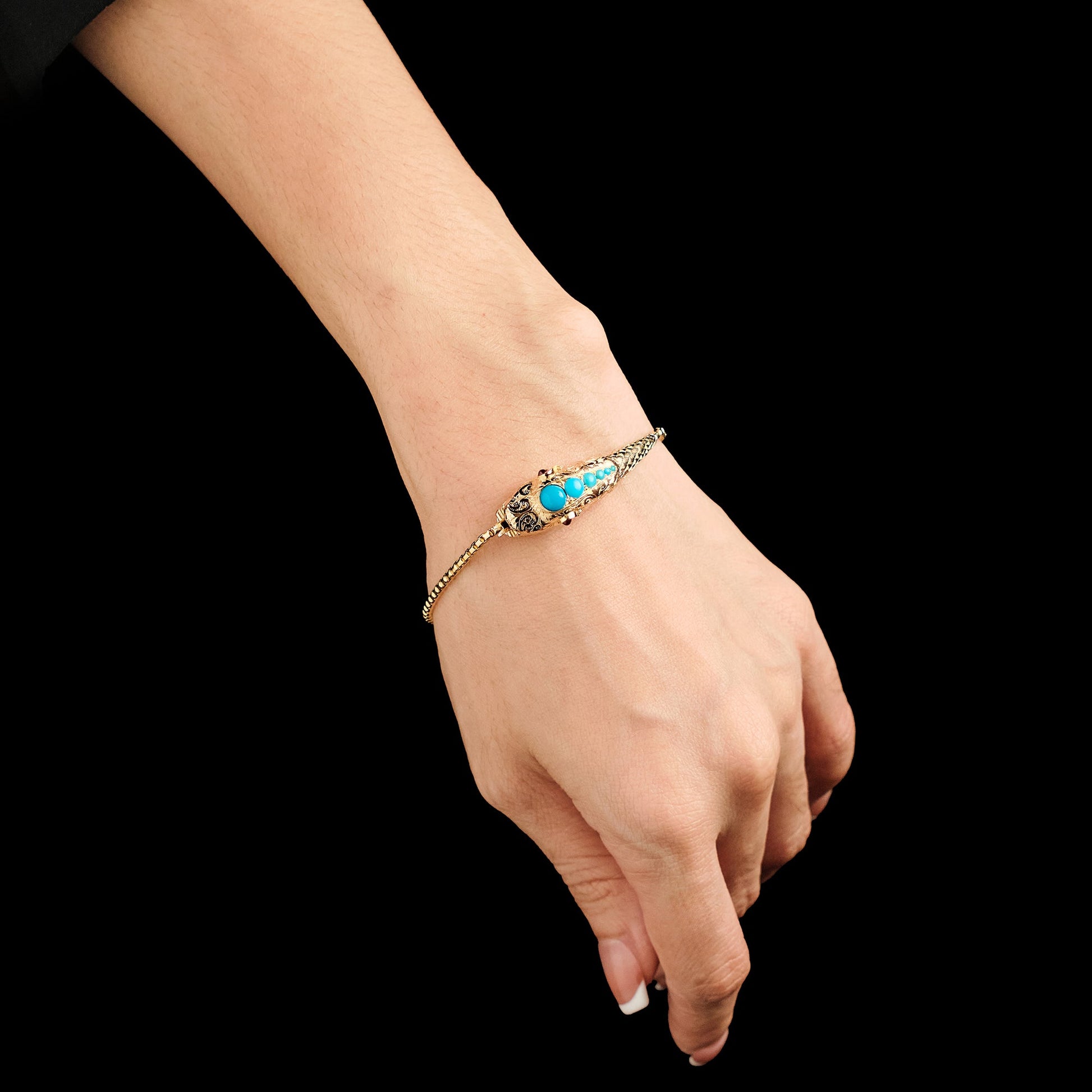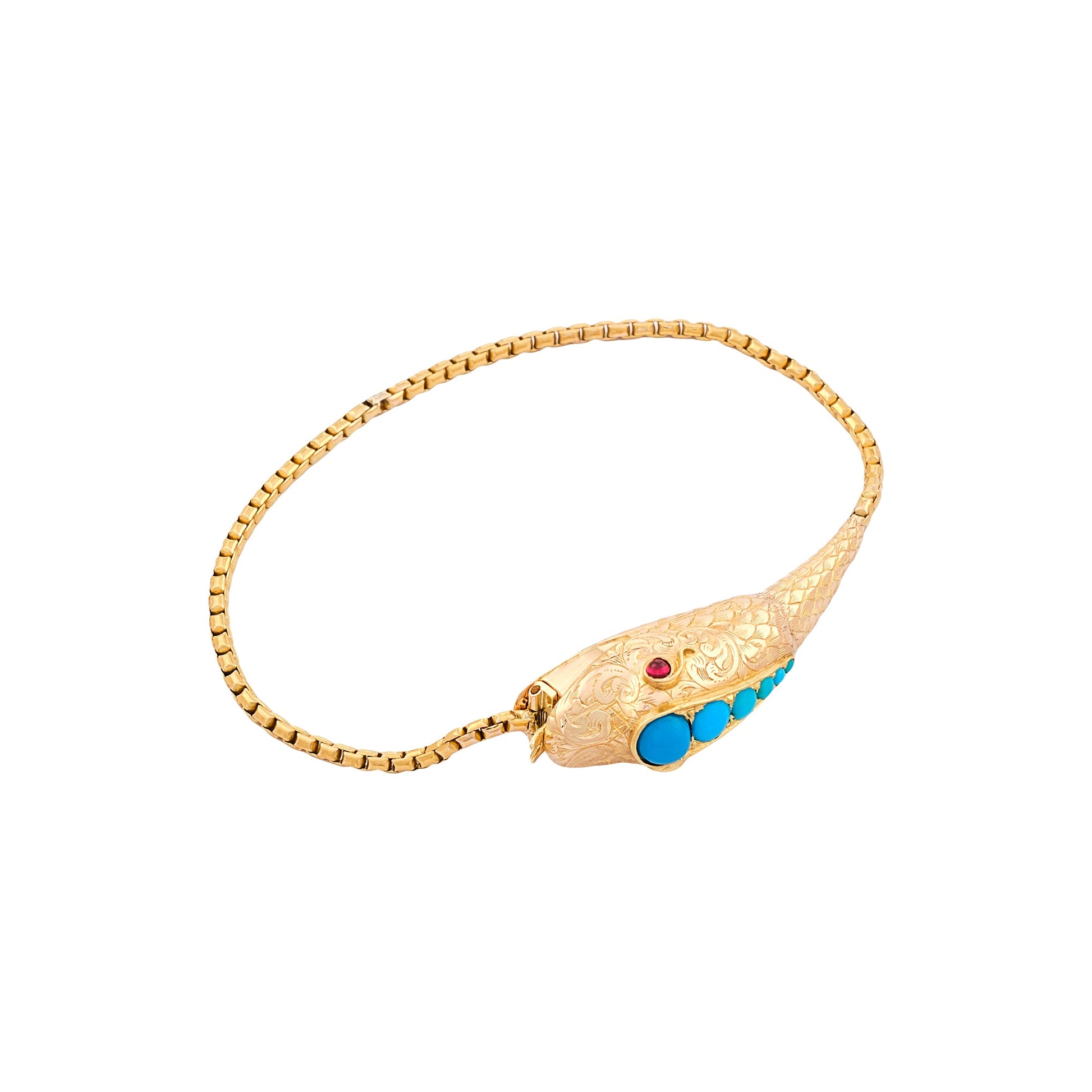 14 Kt yellow gold snake bracelet (biting its own tail), the head set with a row of graduating round cabochon turquoise, the eyes set with round cabochon rubies.