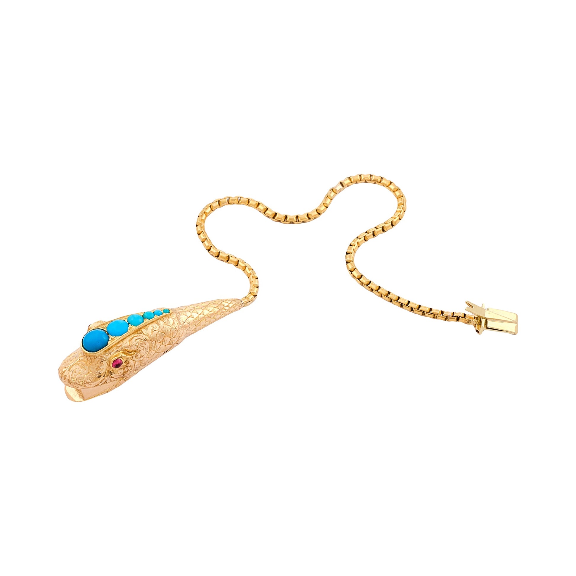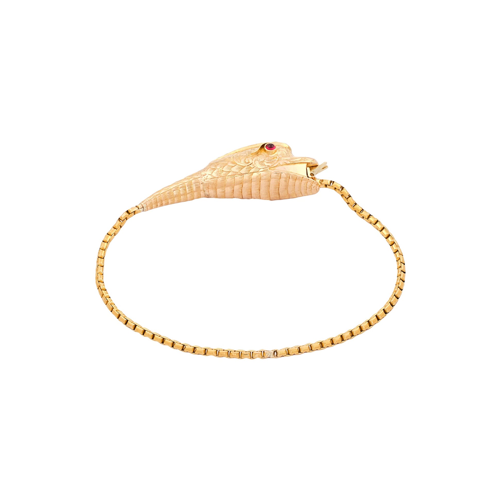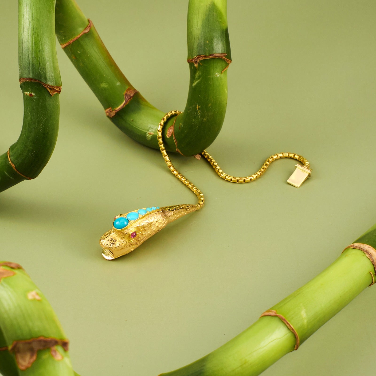 14 Kt yellow gold snake bracelet (biting its own tail), the head set with a row of graduating round cabochon turquoise, the eyes set with round cabochon rubies.
