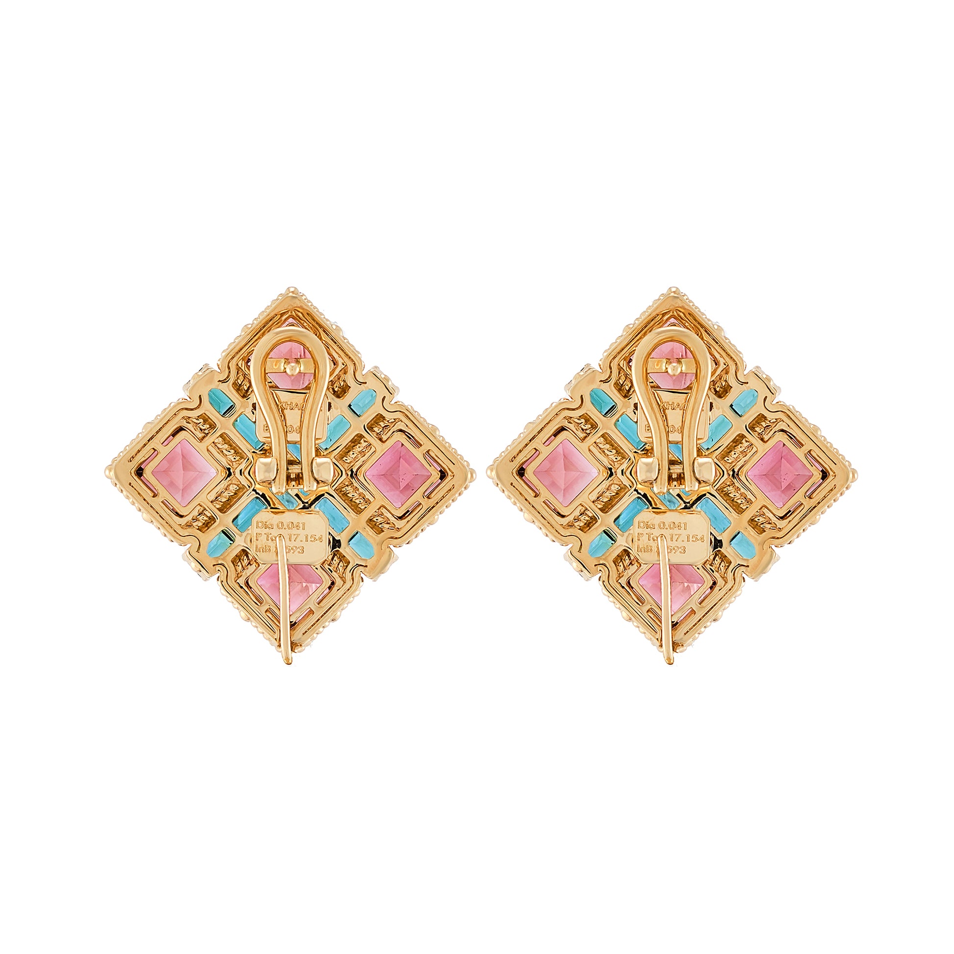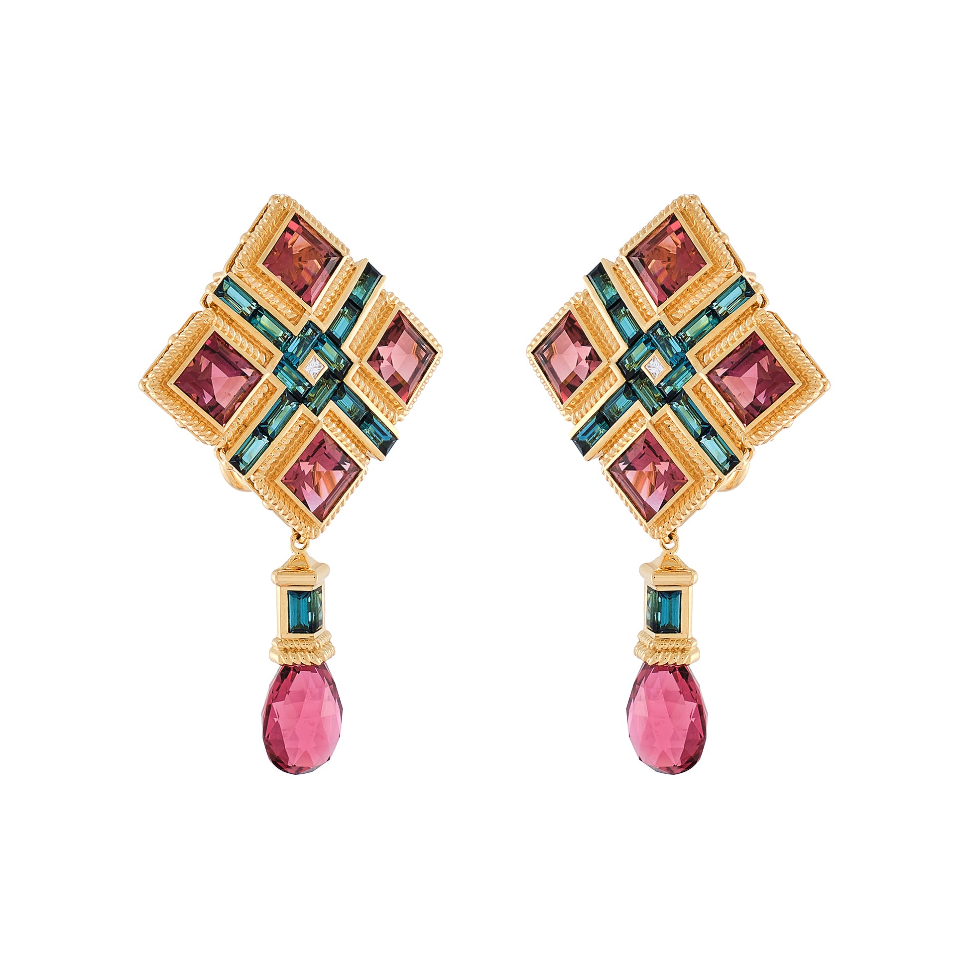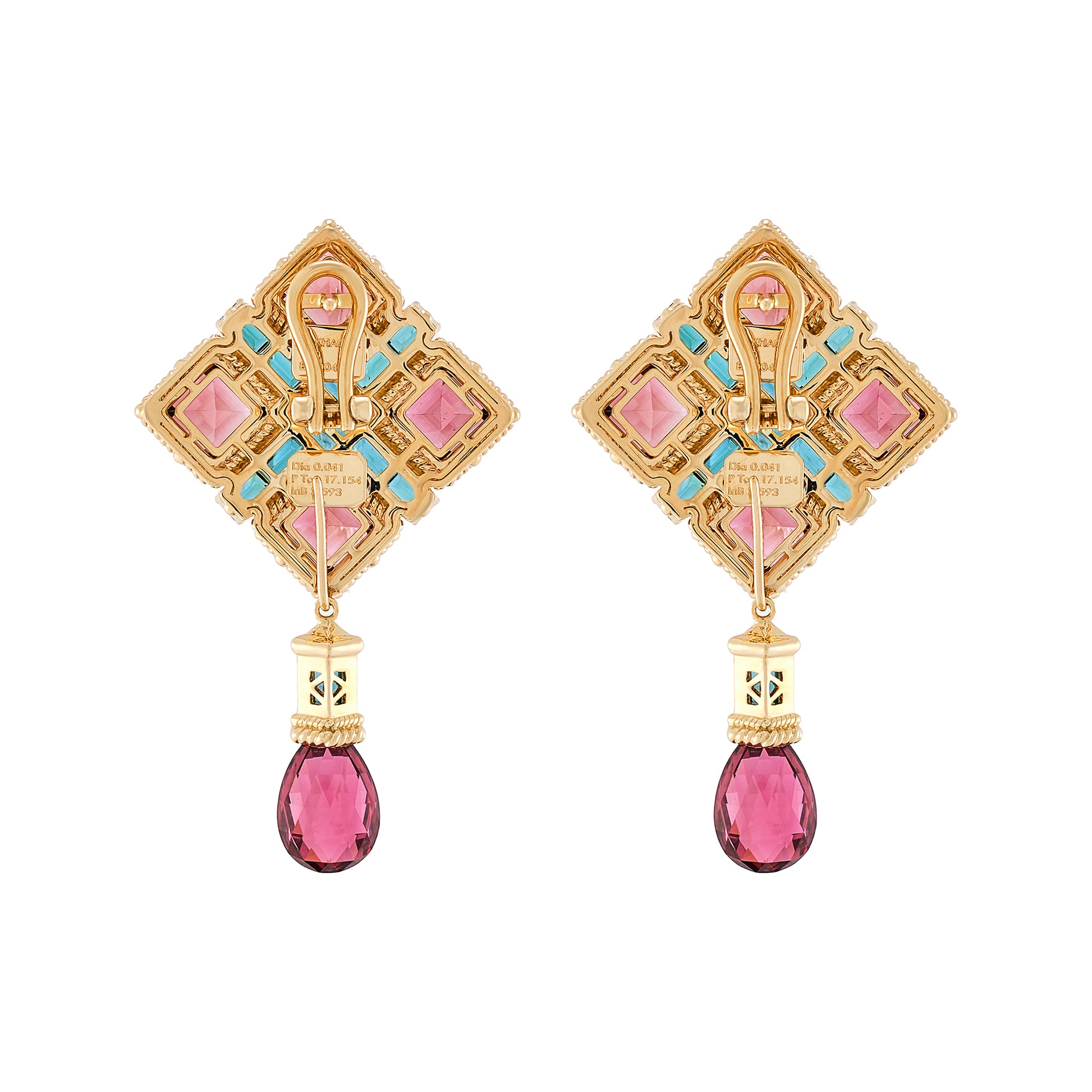 18 Kt yellow gold earrings set with Pink Tourmaline, Blue Indicolite and Diamonds