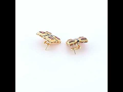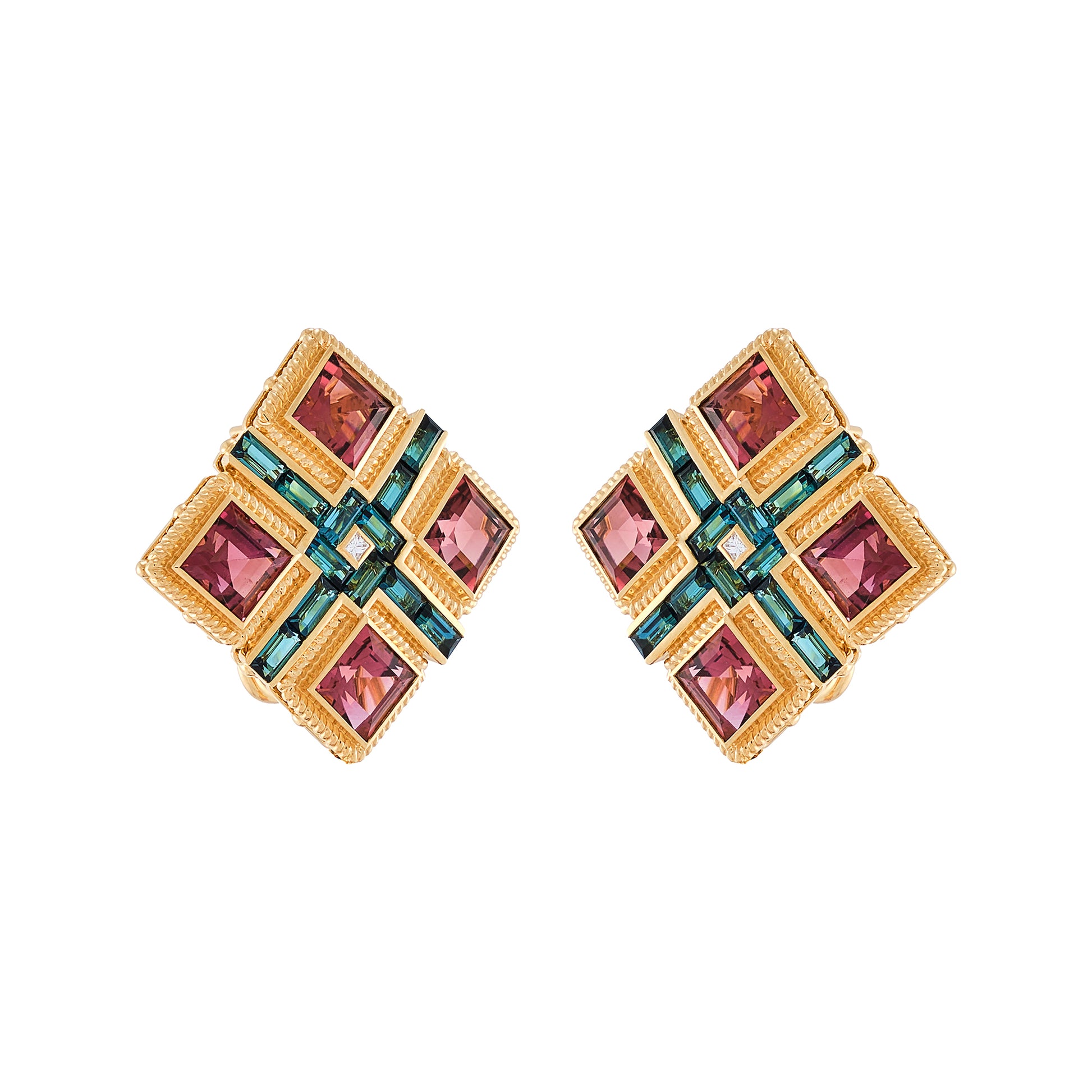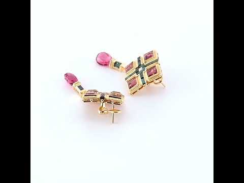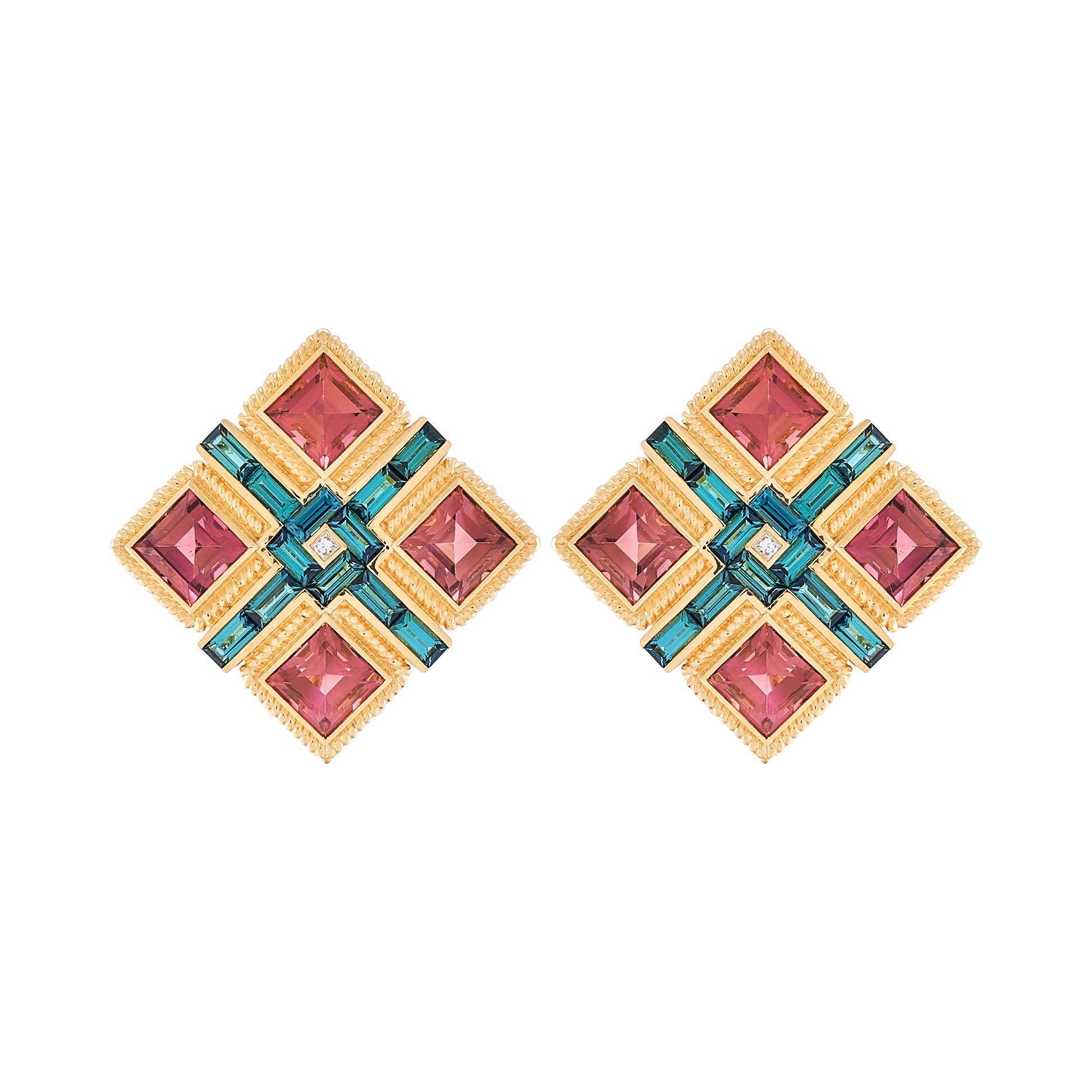 18 Kt yellow gold earrings set with Pink Tourmaline, Blue Indicolite and Diamonds