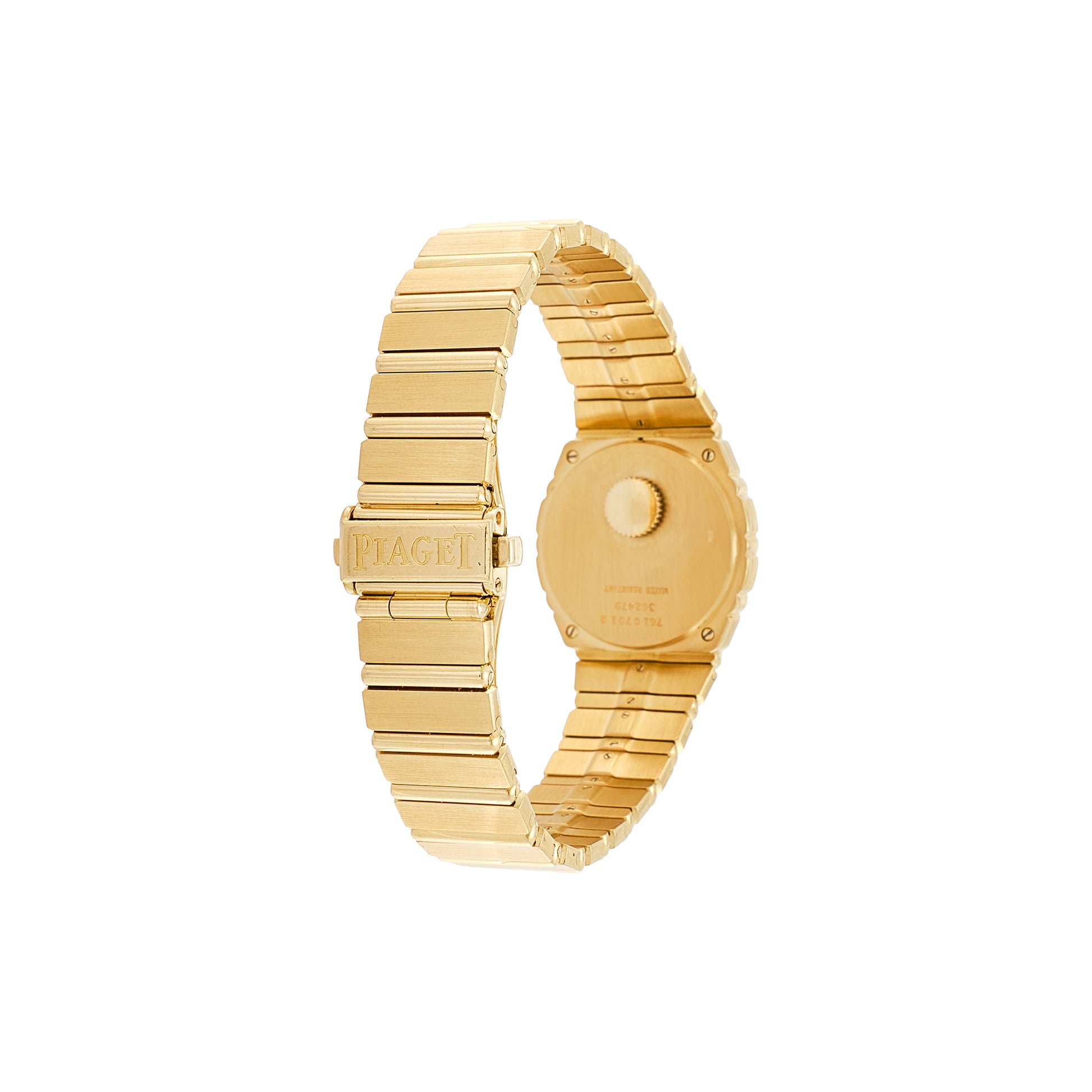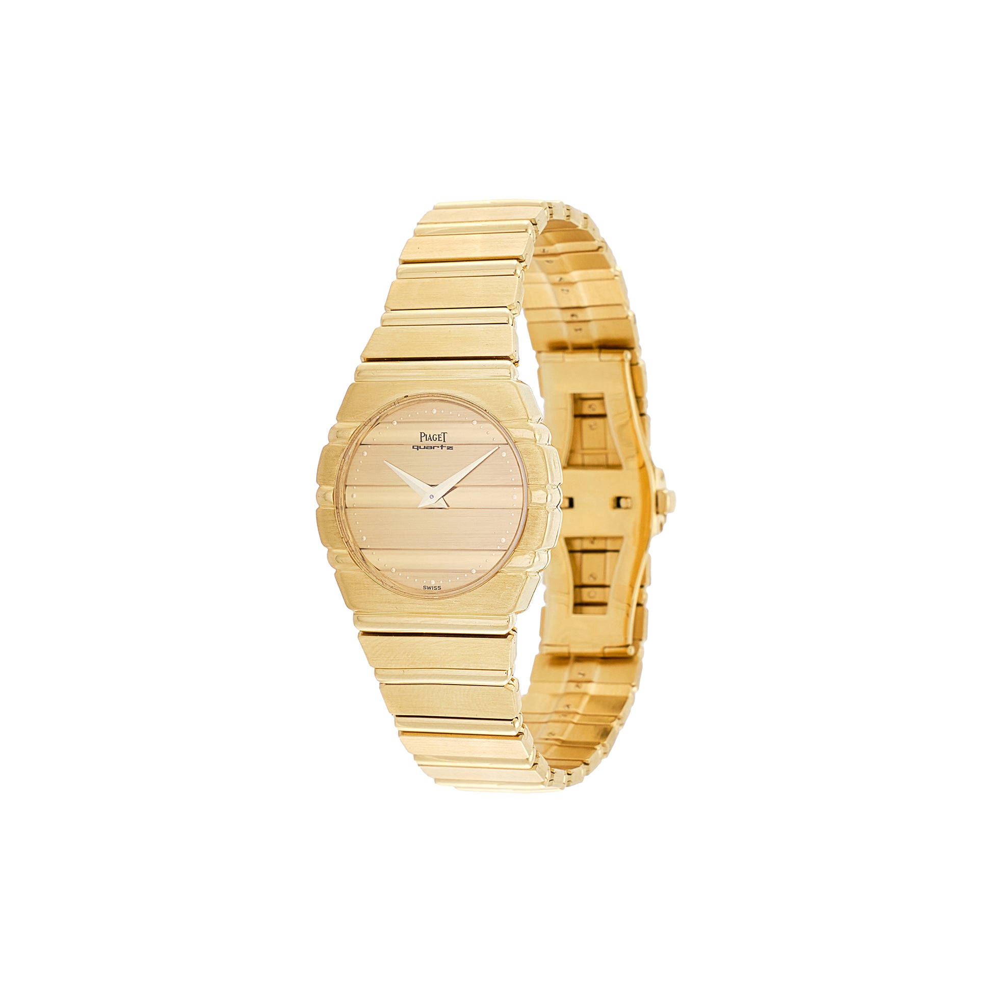 Piaget 18 Kt yellow gold watch. Polo, first series. Dial: yellow gold concrete, ball markers. Hands: 750/1000 yellow gold dauphine hands. Glass: mineral. Movement: quartz signed Piaget