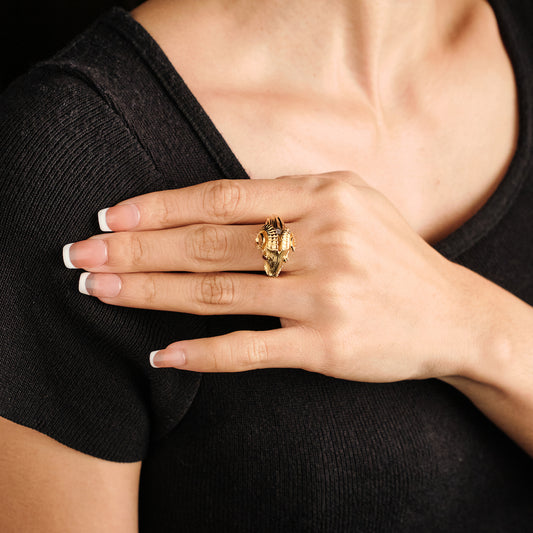 18 Kt yellow gold ring set with citrine and baguette-cut amethyst