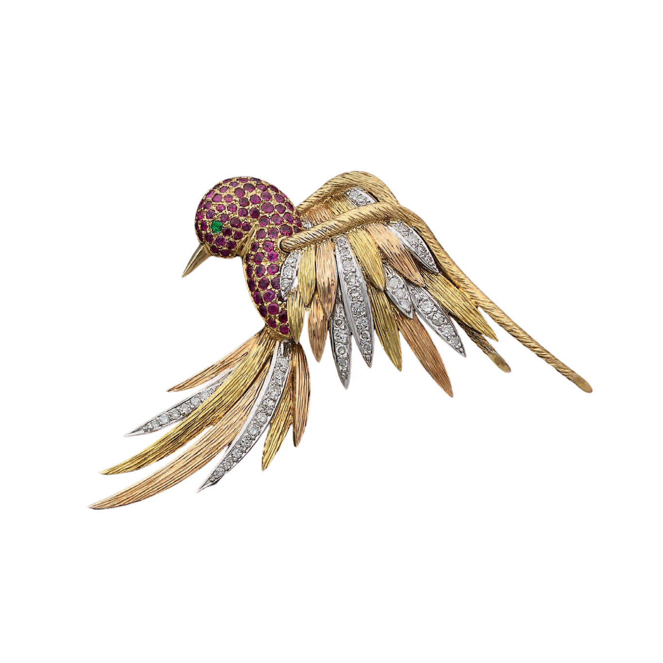 14 kt yellow, rose and white gold bird brooch set with diamonds, rubies and an emerald