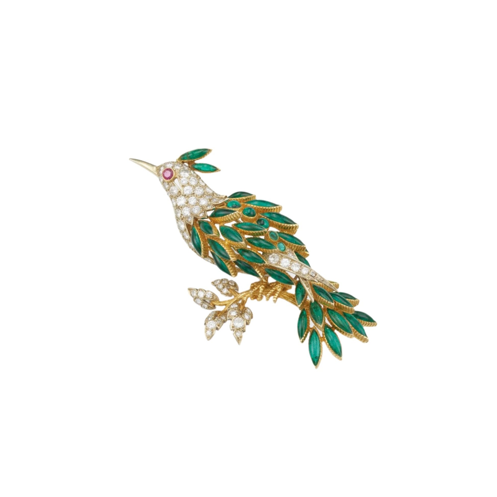 14 Kt white and yellow gold bird brooch set with diamonds, ruby and green glass cabochons
