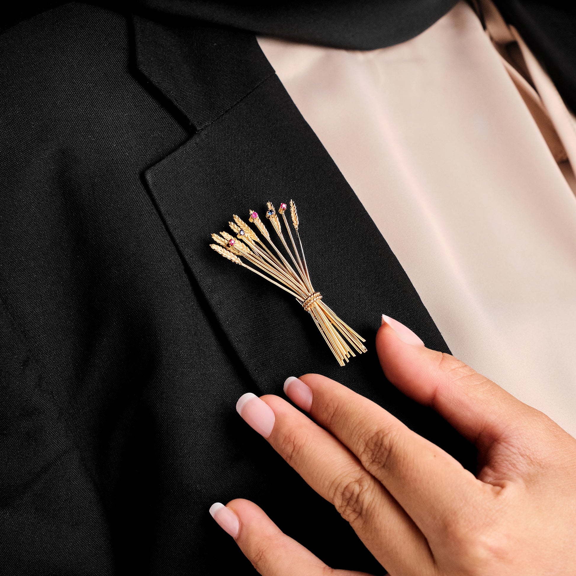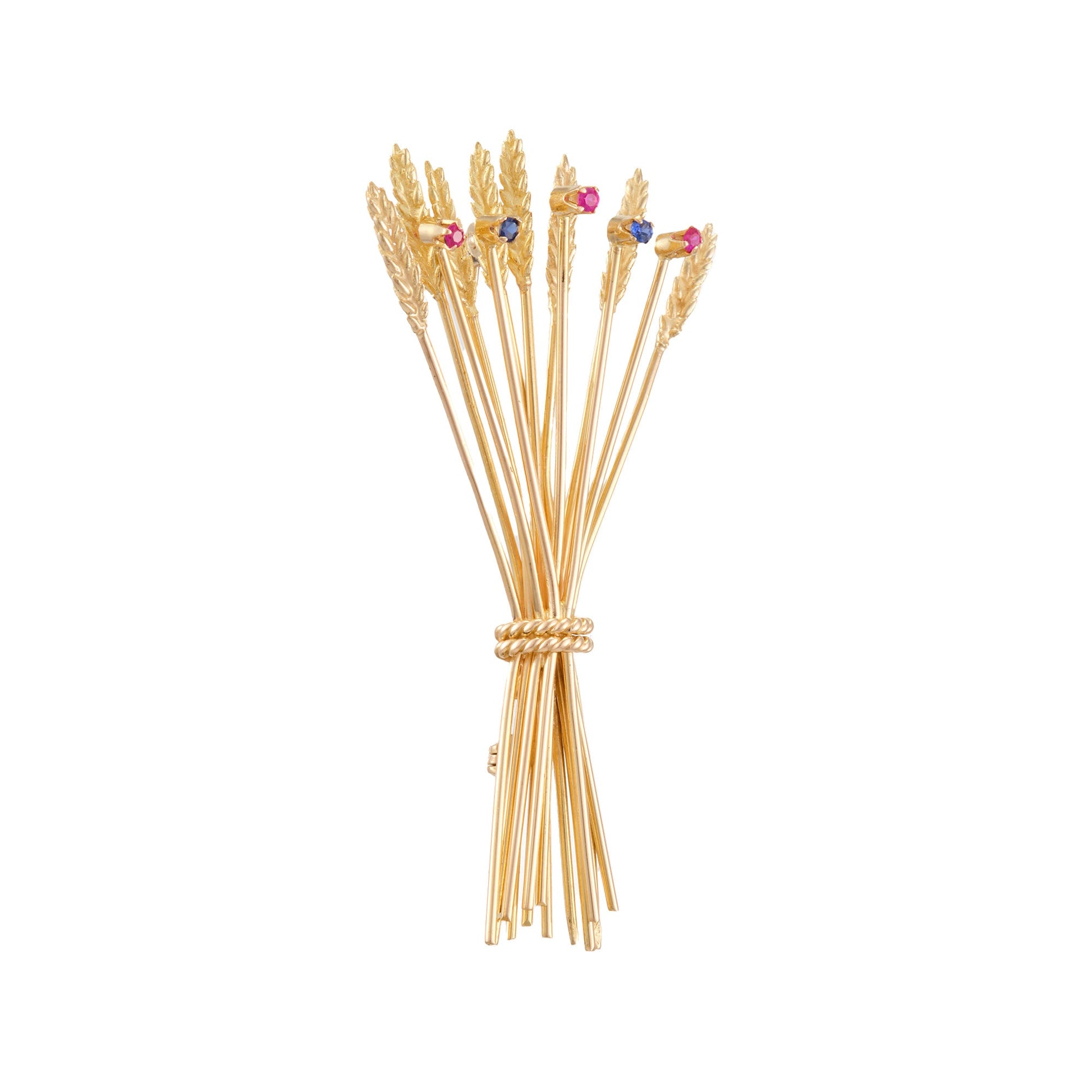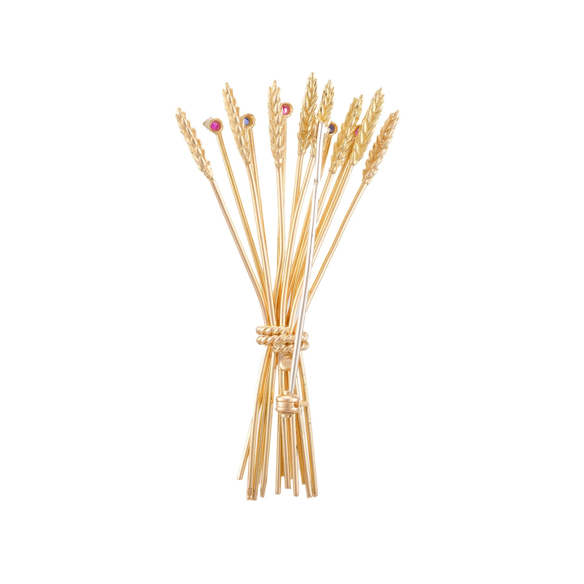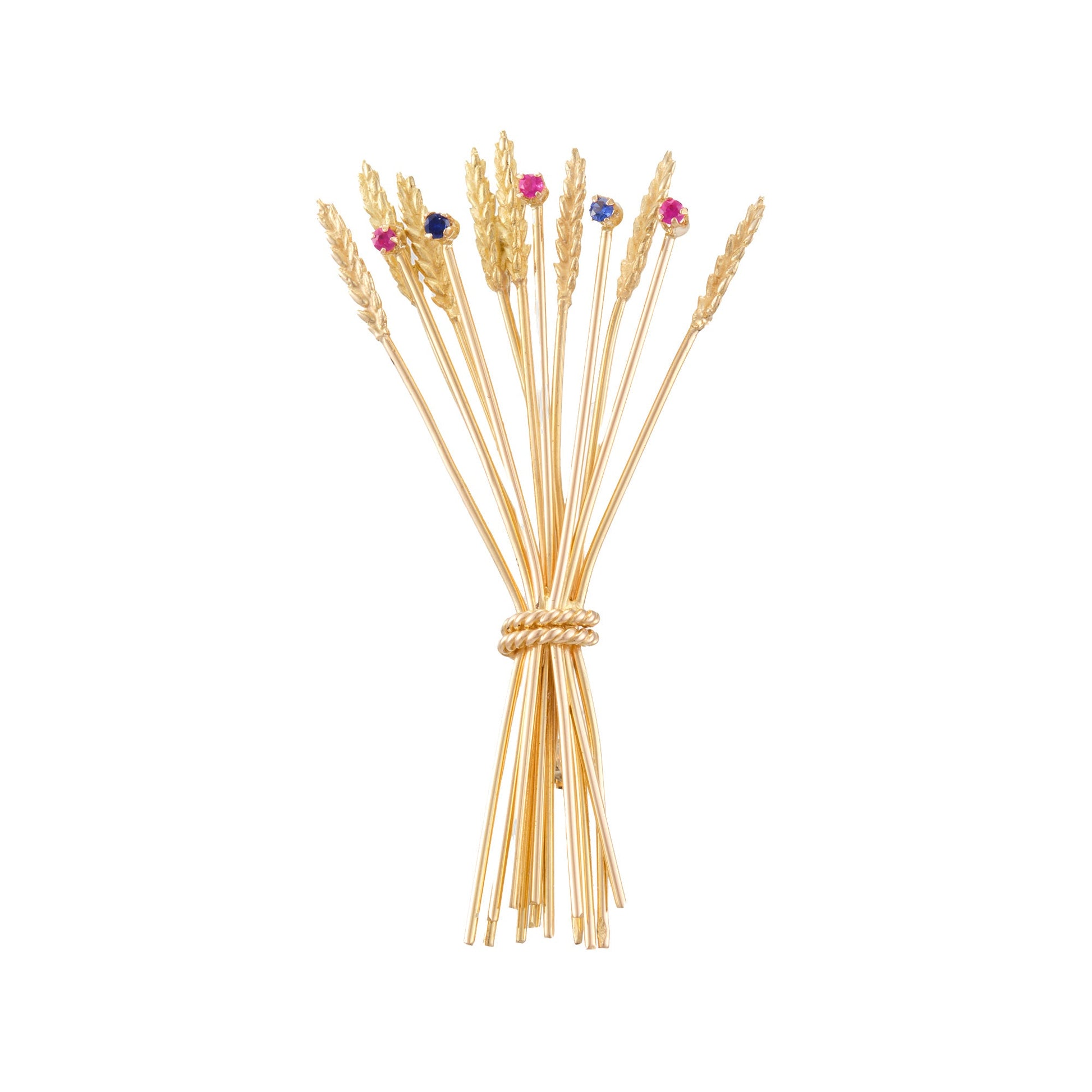 18 Kt yellow gold brooch presenting a bouquet of wheat adorned with three pink and two blue stones.