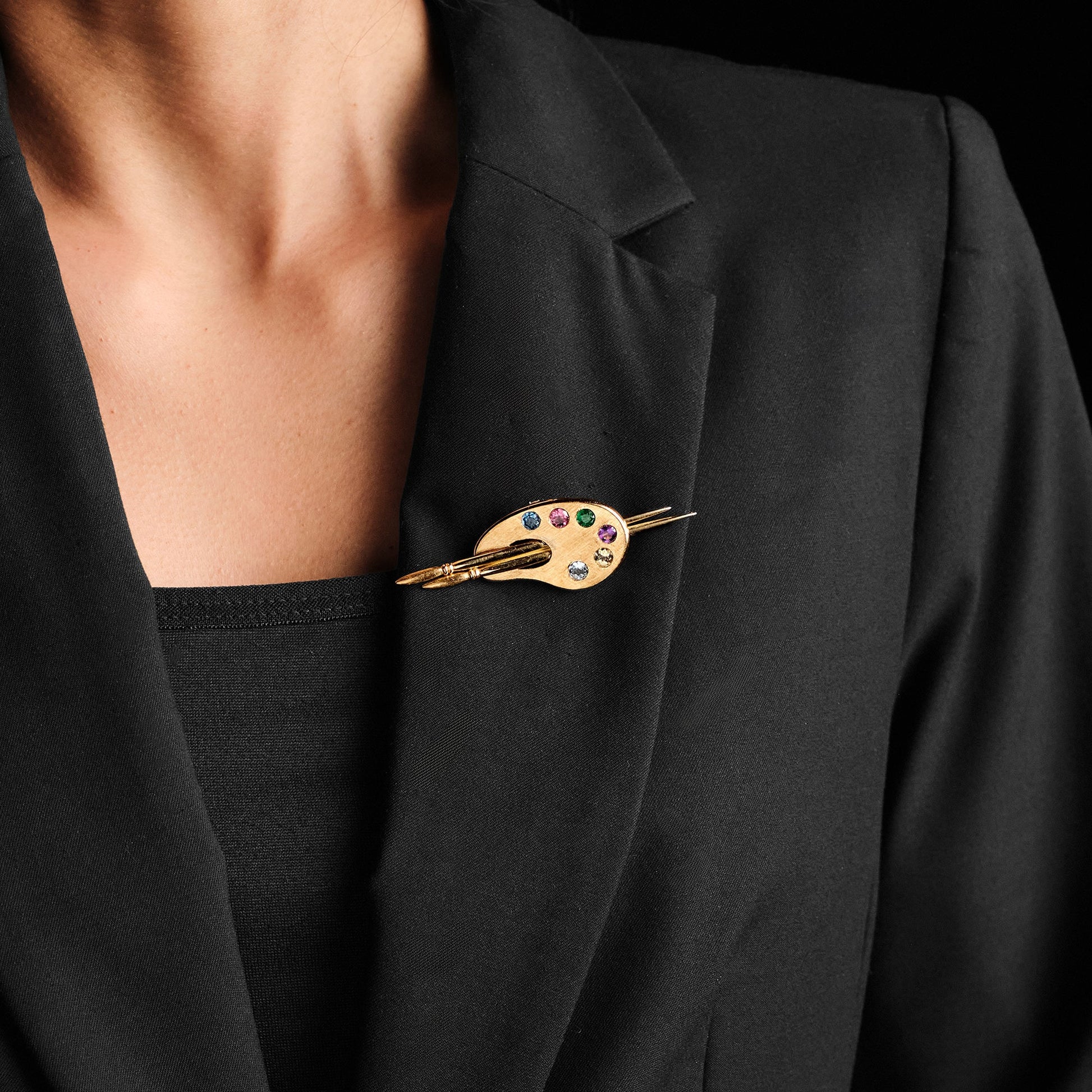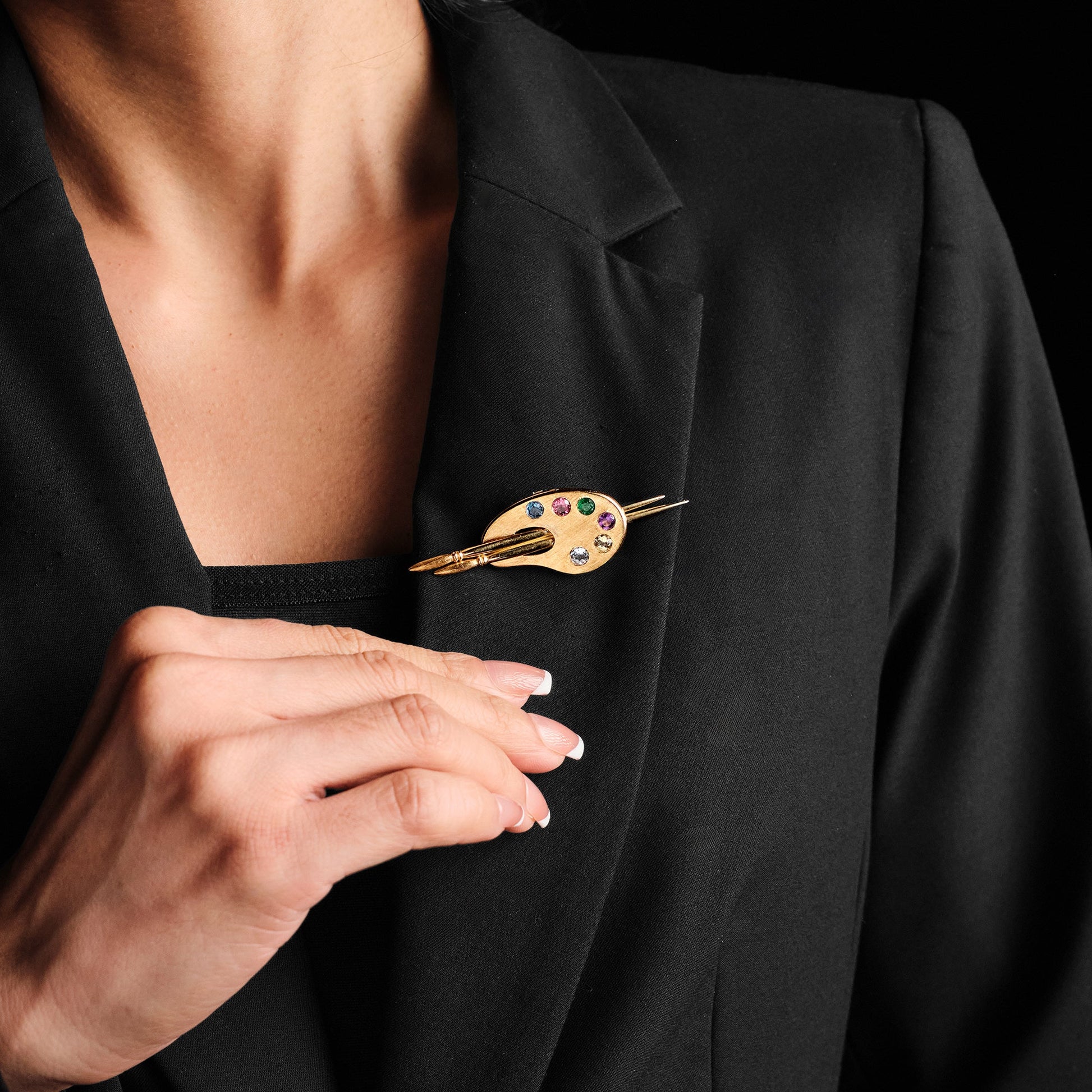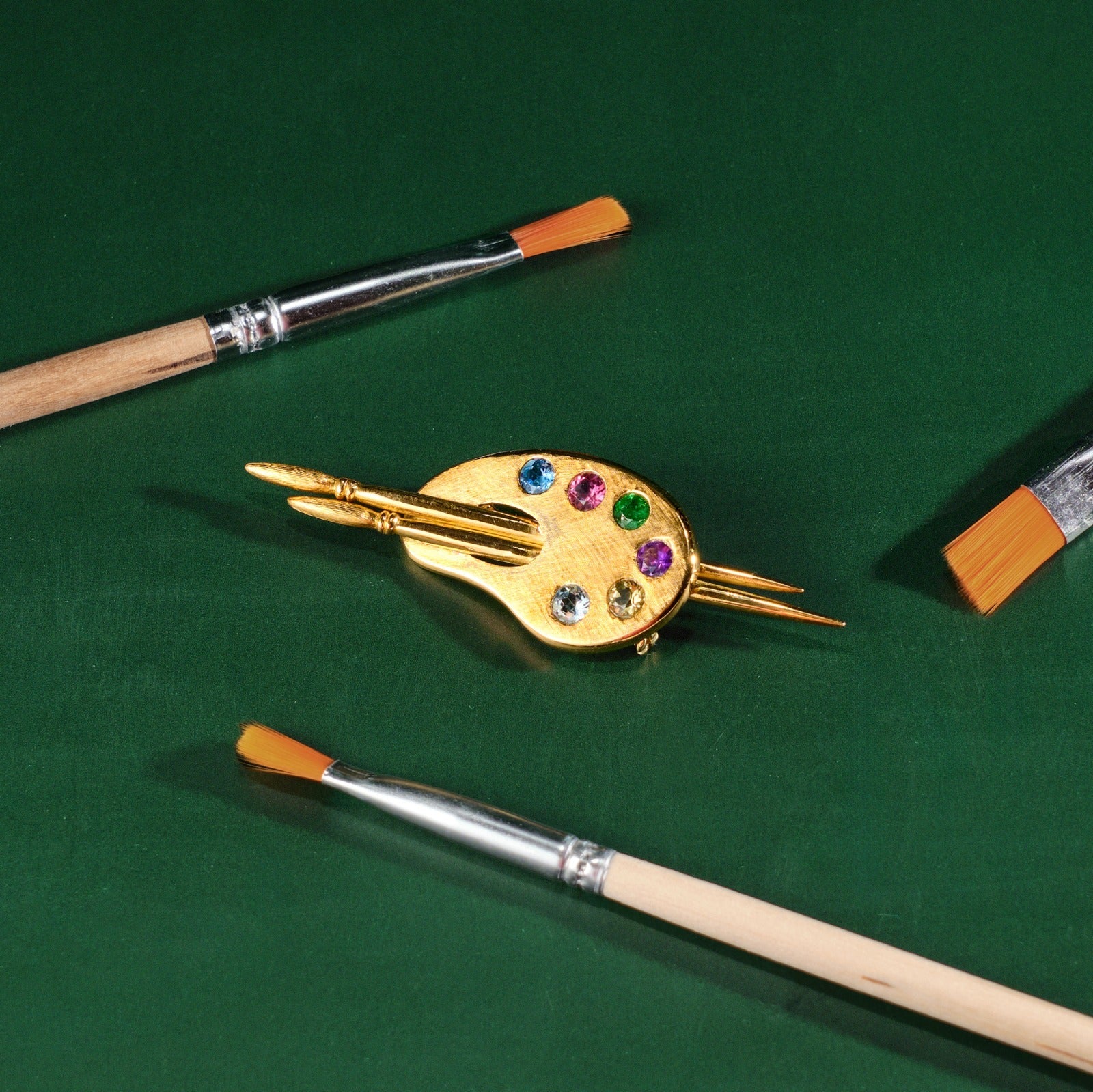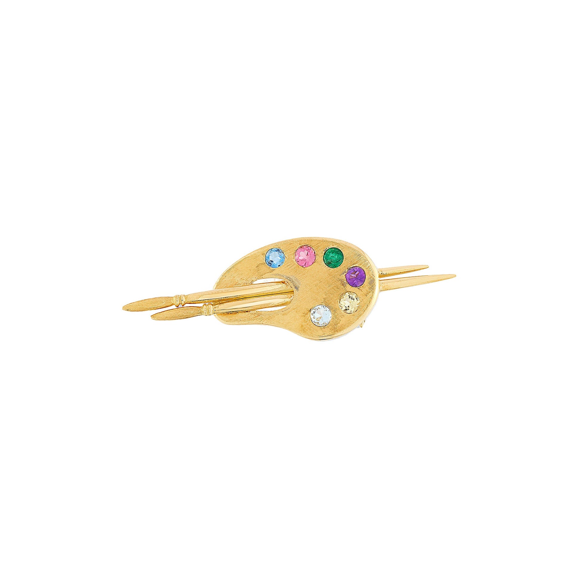 18 Kt yellow gold brooch presenting a painter's palette with two brushes and mixed semi-precious stones.