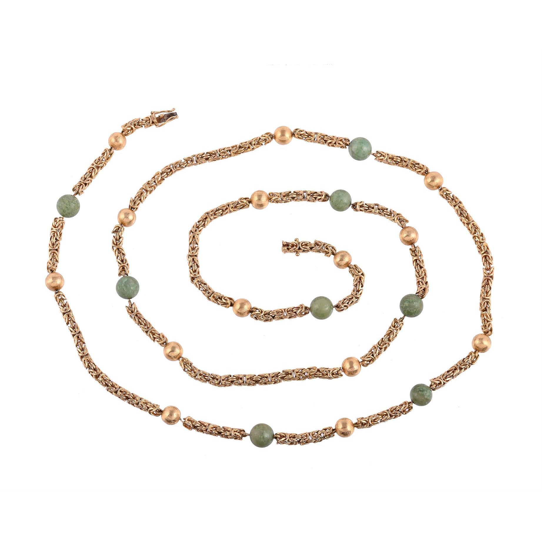 18 Kt yellow gold long chain with Idocrase beads. With a maker's mark WT.