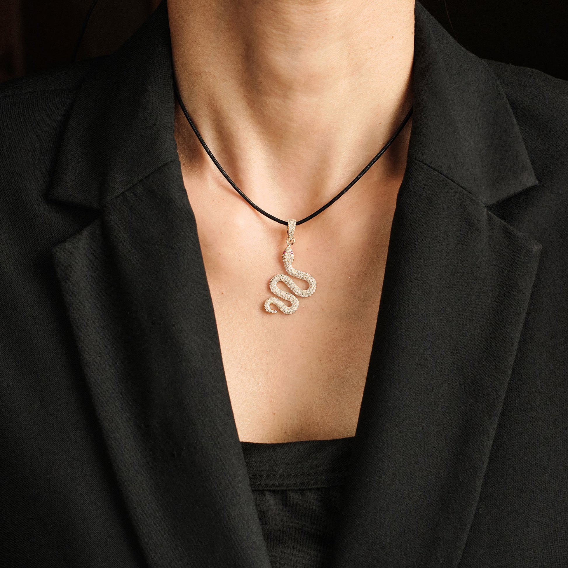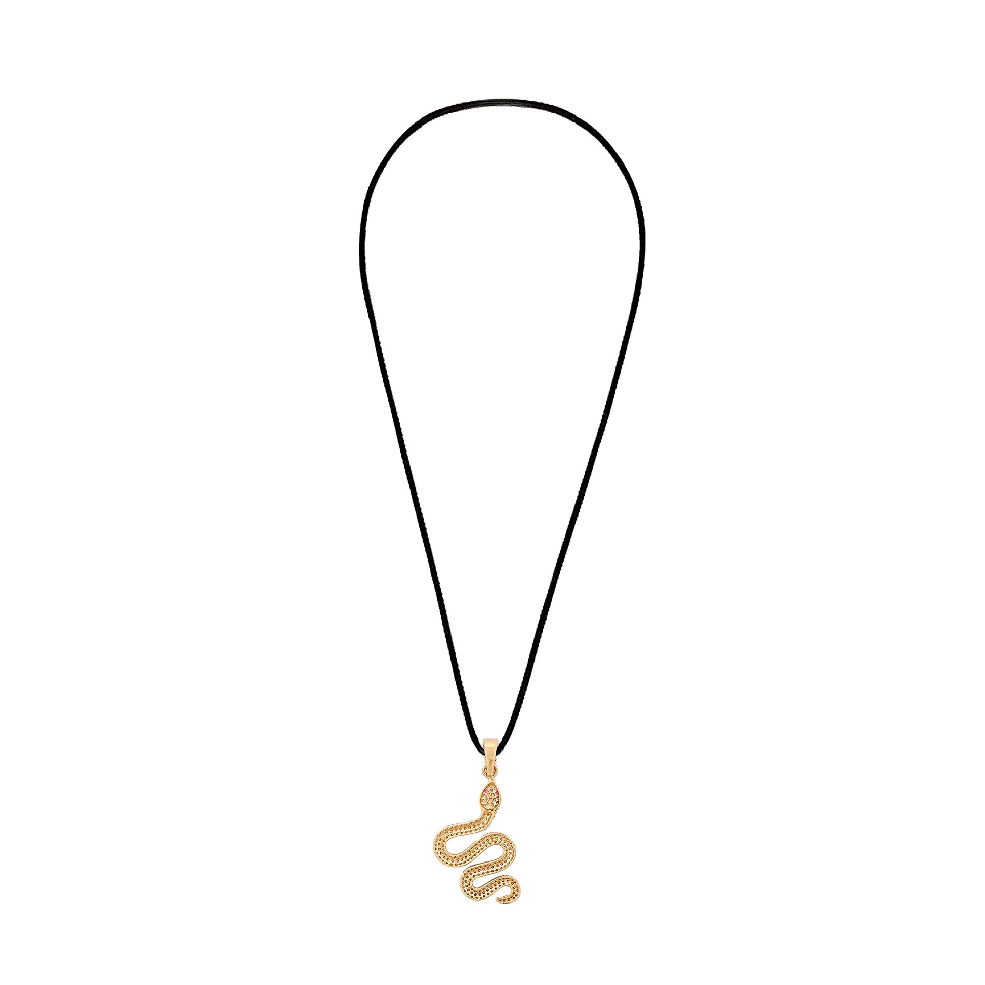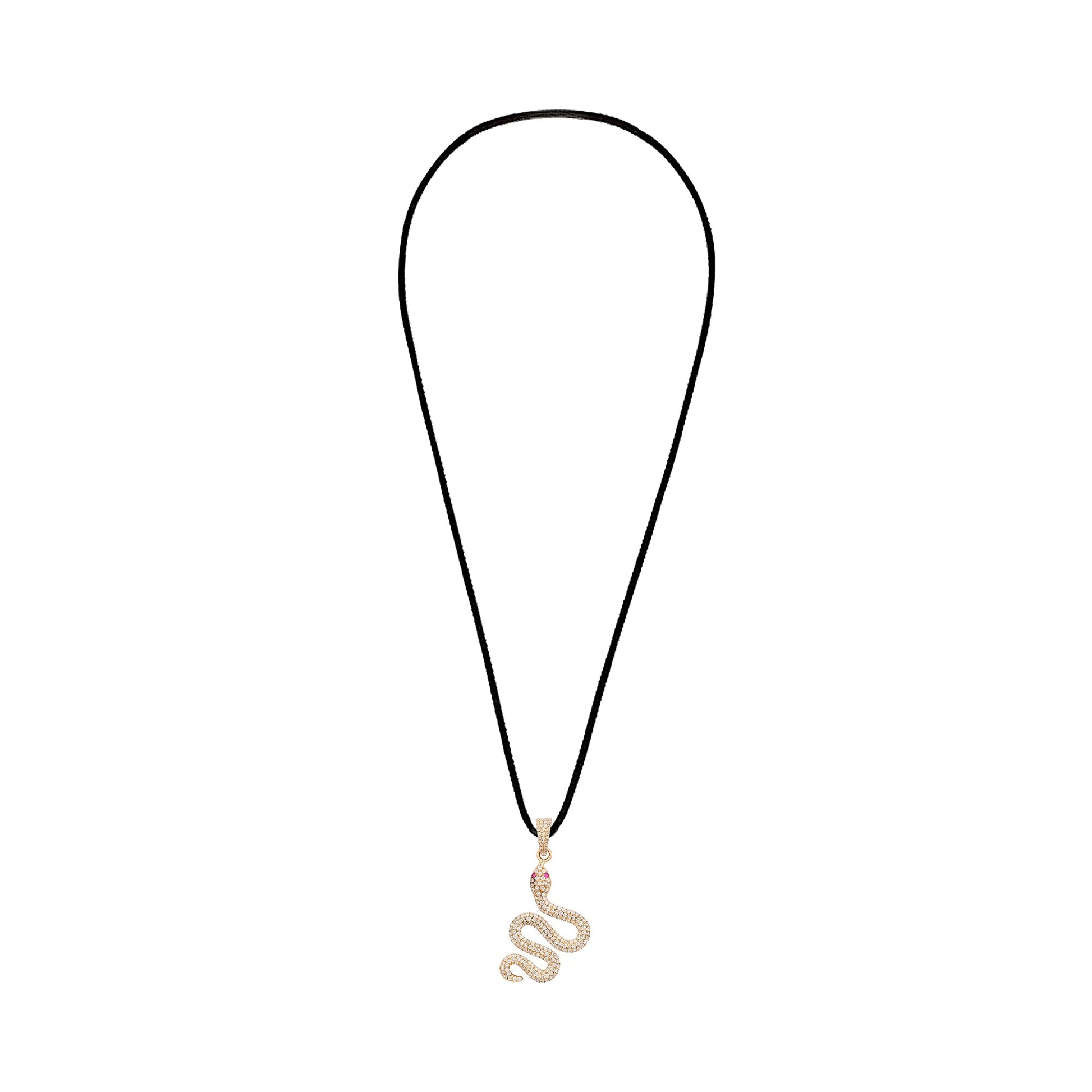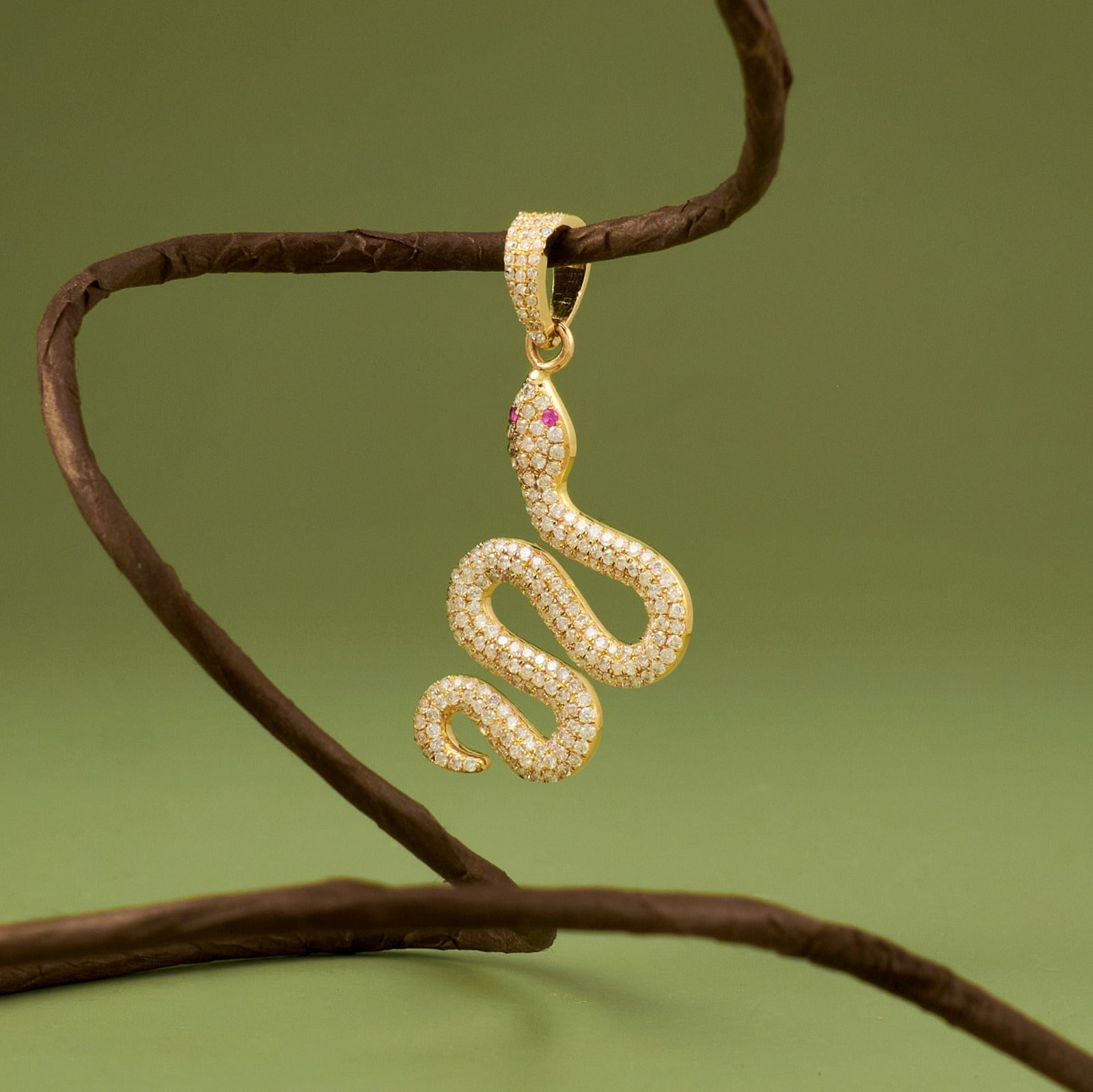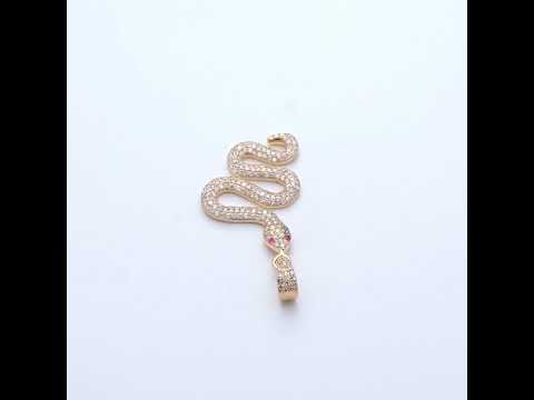 14 Kt yellow gold coiled snake pendant set with round brilliant cut diamonds, the eyes set with round cut rubies.